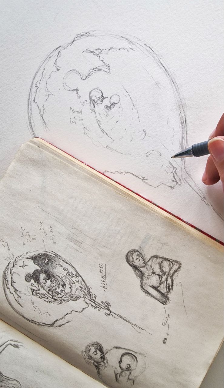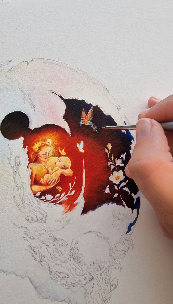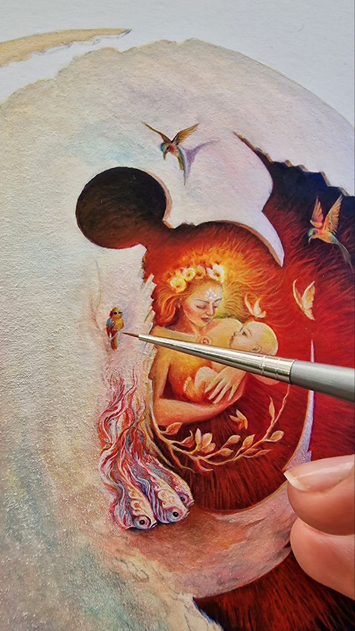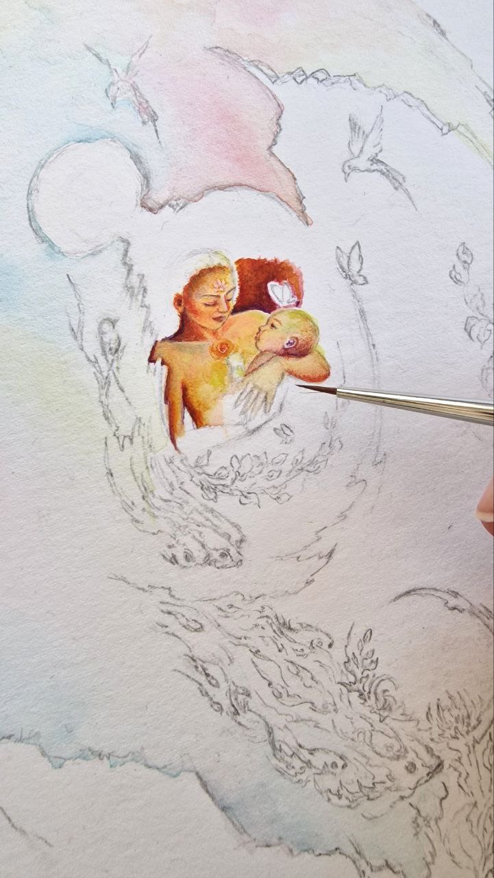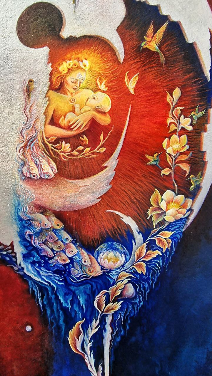 Within a cosmic shell, an infant rests in the embrace of the goddess of Mithra. A radiance of love pours from her body, adorning the world with tenderness; from this love, flowers unfurl, birds and butterflies take flight, and the cosmos draws a renewed breath. The shell opens through this very love, setting life into motion, as colorful fish join the eternal current of existence within a celestial blue river.
